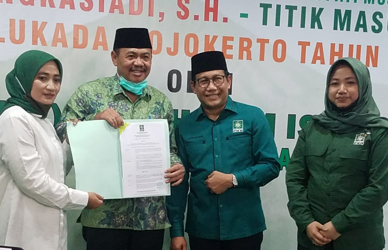Mojokerto Kabupaten-majalahdetektif.com : Akhirnya DPP PKB memilih dan menyerahkan rekomendasi Bakal Calon(Balon) Bupati dan Wakil Bupati Mojokerto H.Pungkasiadi, SH dan Titik Masudah pada Pemilihan Bupati Mojokerto tahun 2020 mengalahkan sekitar 15 Calon Bupati dan Wakil Bupati yang melamar melalui DPC PKB Kabupaten Mojokerto. Rekomendasi tersebut diserahkan langsung oleh Kakak Ketua Umum.DPP PKB Muhaimin Iskandar yang kini juga menjabat Menteri sekaligus sebagai Ketua DPW PKB Jawa Timur, DR.(HC) H.A. Halim Iskandar, Sabtu (8/8/2020) di Ruang Pertemuan Gus Dur- Kantor DPC PKB Kabupaten Mojokerto