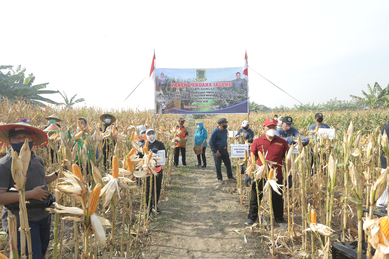 MOJOKERTO- majalahdetektif.com: Lesunya perekonomian adalah salah satu dampak yang diakibatkan oleh pandemi covid-19, meski demikian Pemerintah Kota tidak hanya berpangku tangan menunggu bantuan dari pemerintah pusat tetapi berupaya bangkit melalui Program Upaya Pangan Mandiri (PUMP). Pada Jumat (16/10) yang bertepatan dengan Hari Pangan Sedunia, Wali kota Mojokerto bersama Wawali Achmad Rizal Zakaria, Sekdakot Mojokerto Harlistyati serta jajaran kepala OPD di lingkungan Pemerintah Mojokerto mengikuti panen perdana tanaman jagung serta penyerahan bantuan permodalan di balai Kelurahan Gunung Gedangan.