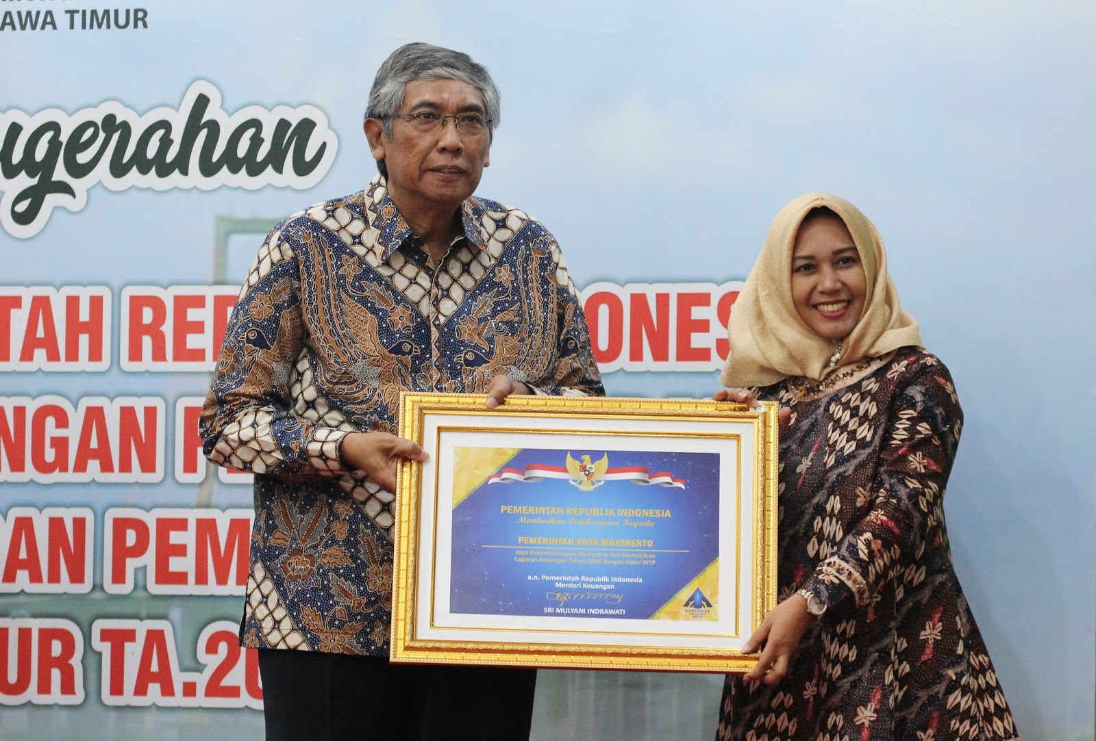 Pemerintah Kota Mojokerto, kembali menerima penghargaan dari Pemerintah Republik Indonesia atas perolehan capaian standar tertinggi atau opini Wajar Tanpa Pengecualian (WTP) terhadap Laporan Keuangan Pemerintah Daerah (LKPD) Tahun Anggaran 2018. Penyerahan penghargaan dari Wakil Menteri Keuangan RI, Prof. Dr. Mardiasmo, M.B.A, diterima langsung oleh Wali Kota Mojokerto Ika Puspitasari di Gedung Negara Grahadi, Surabaya, Rabu (2/10) siang.