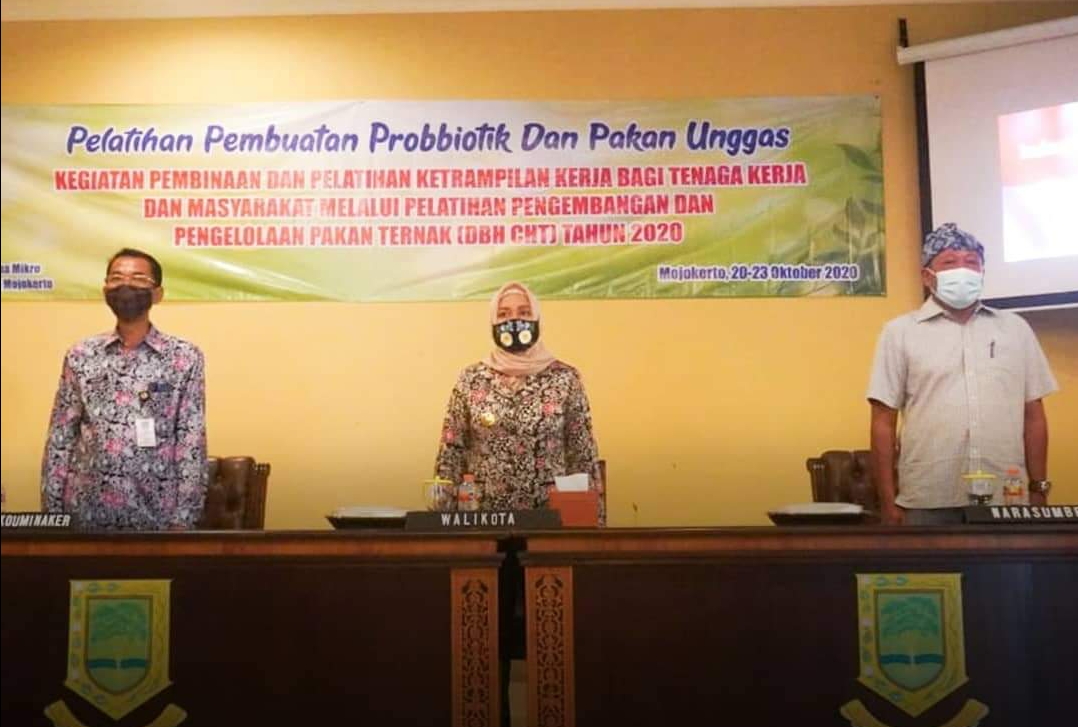 Mojokerto Kota-majalahdetektif : Wali Kota Mojokerto Ika Puspitasari, dengan didampingi Pelaksana Tugas Kepala Diskouminaker Hariyanto, menghadiri Pelatihan Pembuatan Probiotik dan Pakan Unggas di Hall Graha Mojokerto Service City (GMSC), Selasa (20/10/2020).